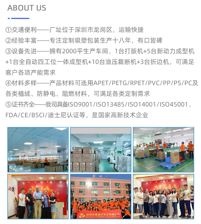 91免费网页看片位于深圳市龙岗区,具有便利的交通条件,专注91免费视频观看生产十八年,具备丰富的生产经验。公司拥有2000平生产车间、1台打版机+5台新动力成型机+1台全自动四工位一体成型机+10台油压裁断机+3台折边机,满足各项产能需求,现生产材料有APET/PETG/PVC/PP/PS/PC及各类植绒、防静电、阻燃材料,能满足各类定制需求。我司具备ISO9001/ISO13485/ISO14001/ISO45001、FDA/CE/BSCI/迪士尼认证,是国家高新技术企业。