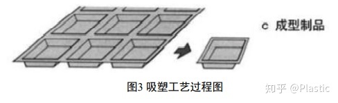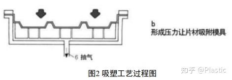 在加工过程中,塑料片加热后,然后快速将其与模具间空气抽走,造成真空状态,形成压力差,这样塑料片就贴服在模具的成型面上,如图2。