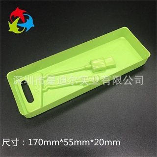 本款产品由拥有一流生产设备、具有十分丰富生产经验的吸塑加工厂依据客户提供的实物以及相关要求而自行设计定做的一款吸塑产品。绿色PVC吸塑盒采用环保绿色PVC片材为原材料,经热加工处理后成型的吸塑内托,能够在保证对环境无公害的同时也便于客户在购买时的挑选。绿色PVC吸塑盒独特的设计形式使产品看上去更加美观,便于吸塑制品在销售中的展示。