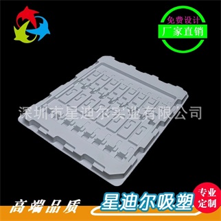 本款产品由吸塑加工厂采用PET为原材料,经过吸塑工艺热成型后形成的塑料制品,再由刀模冲切出完整的吸塑盒。白色吸塑托盘颜色为白色,能够与实物形成一定的反差,刺激消费者的购买欲望便于在销售中的展示,材质环保对环境无污染,是一款“绿色”产品。白色吸塑托盘可以装多个电子五金配件,不占空间,节约成本。