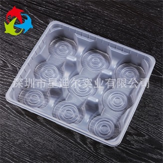 本款产品是依据客户提供的实物和相关要求而是设计定做的一款吸塑产品,采用环保PP材质为原材料,在保证对环境无公害的同时也能便于客户在购买时的挑选。蛋糕吸塑内托可以装入九枚小蛋糕,便于产品的销售,独特的设计使产品看上去更加美观,有利于产品的展示。