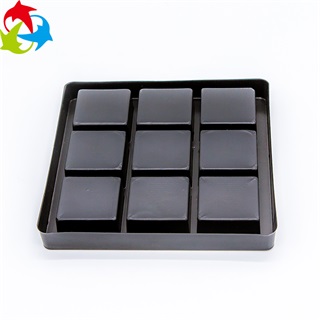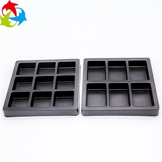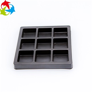 产品特点:该款产品是由深圳吸塑厂采用黑色PS材质按照客户提供的实物而设计定制的样式经吸塑工艺热成型加工后形成的塑料制品,本款产品环保无公害,尽显高端大气,为产品增值提升档次。巧克力吸塑盒在运输过程中起到很好的保护作用,避免在运输过程中因碰撞、挤压而导致产品变形、损坏,从而影响公司形象。吸塑盒的设计形式分为九格和六格,便于装入巧克力,能够很好的销售,吸引客户的购买欲望。